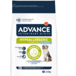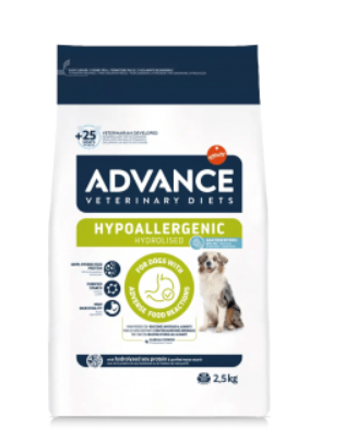 ADVANCE DOG VETERINARY DIETS HYPOALLERGENIC е лечебна хипоалергенна храна за кученца и възрастни кучета с хранителни алергии и непоносимости. Съдържа един единствен източник на протеин – хидролизиран соев протеин с много ниско молекулно тегло и пречистено нишесте (единствен източник за въглехидрати). Подпомага храносмилането при кучета с хранителни алергии и непоносимости. Освен това, благодарение на хипоалергенното си покритие, храната има стахотен вкус. С добавка кокосово масло – източник на бързо абсорбиращи се мастни киселини.