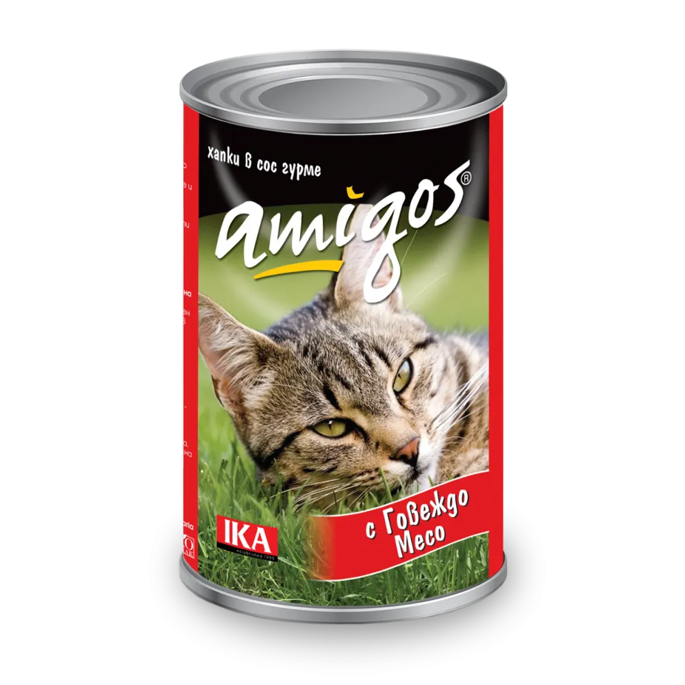 Amigos Beef Adult Cat е пълноценна храна с говеждо месо в сос гурме за израснали котки от всички породи, съдържаща витамини и минерали, необходими за оптималното развитие и състояние на вашата котка.