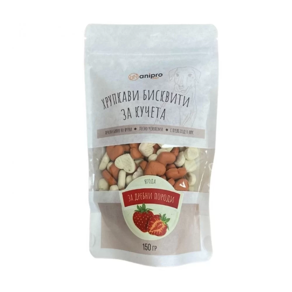 Бисквити за кучета anipro във формата на ягода. Подходящи са за всякакви породи. Изпечени на фурна, те са здравословна и вкусна награда за домашния ви любимец.
