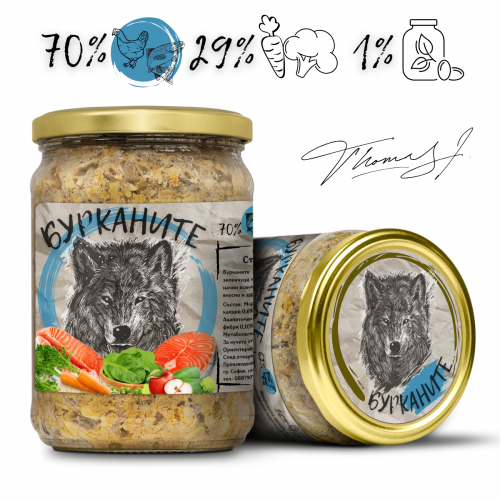 Бурканите са ежедневна храна за домашни зверове. Приготвени са от месо, зеленчуци и хранителни добавки. Готви се в буркан чрез стерилизация. По този начин всички полезни вещества остават в буркана, което прави менюто питателно, вкусно и здравословно. Натурална храна без консерванти, овкусители и оцветители.
