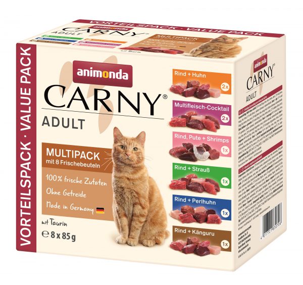 Голяма доза вкусно кулинарно изкушение за израснали писани от 1 до 6-годишна възраст. Кутията , Animonda Carny , включва 8 пауча от по 85 гр, които мъркащите любимци определено ще харесат. Направени са от специално избрано прясно и много апетитно месо. Съдържат всички ценни за котките съставки в този етап от техния живот.