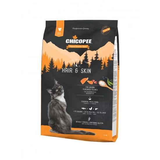 Представяме ви новата храна за котка Chicopee Holistic Nature Line Hair&Skin, която помага за здрава кожа и красива козина на мъркащите домашни любимци. Тя е с високо съдържание на есенциални мастни киселини, 4% сьомга, 34% птиче месо и 9.5% черен дроб. Тази рецепта е без зърнени храни, съдържащи глутен. Подходяща е за израснали котки, особено породисти, на които ще помогне да поддържат елегантни, блестящи и еластични кожа и козина.