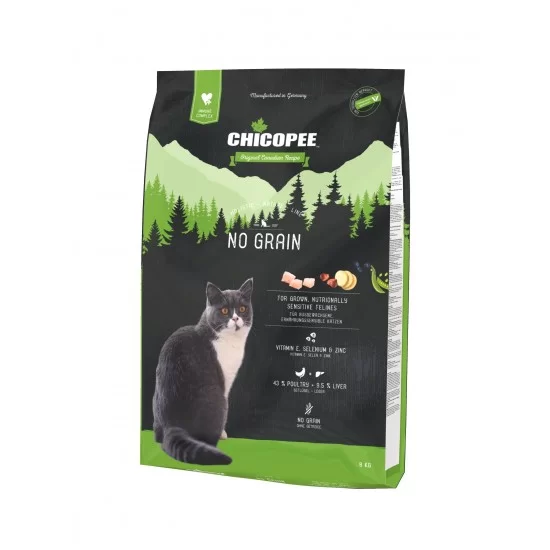 Храната за котки Chicopee Holistic Nature Line No Grain е предназначена за възрастни и чувствителни към храненето котки. Отличава се с висок процент месо от домашни птици (43% – свежо и сушено) и без зърнени култури. Птиците са особено лесно смилаем и висококачествен източник на протеини.
