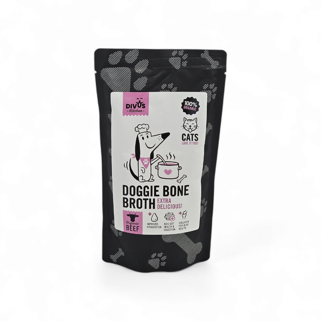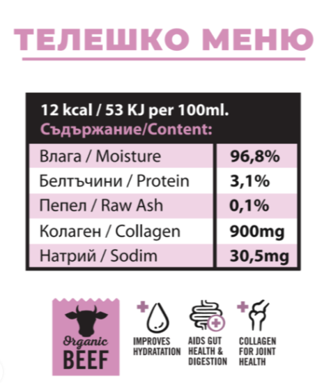 - До два месеца отшумява болката в ставите и сухожилията.Телешкият костен бульон е богат на протеини и съдържа високо количество колаген, лесно смилаем, което го прави подходящ за кучета с по-чувствителен стомах. Той е бавно приготвен от кости на органично пасищни говеда, не съдържа подправки и е специално създаден за кучета и котки. Добавката е подходяща за всички домашни любимци, без значение от размера, възрастта, породата или различните видове диети.