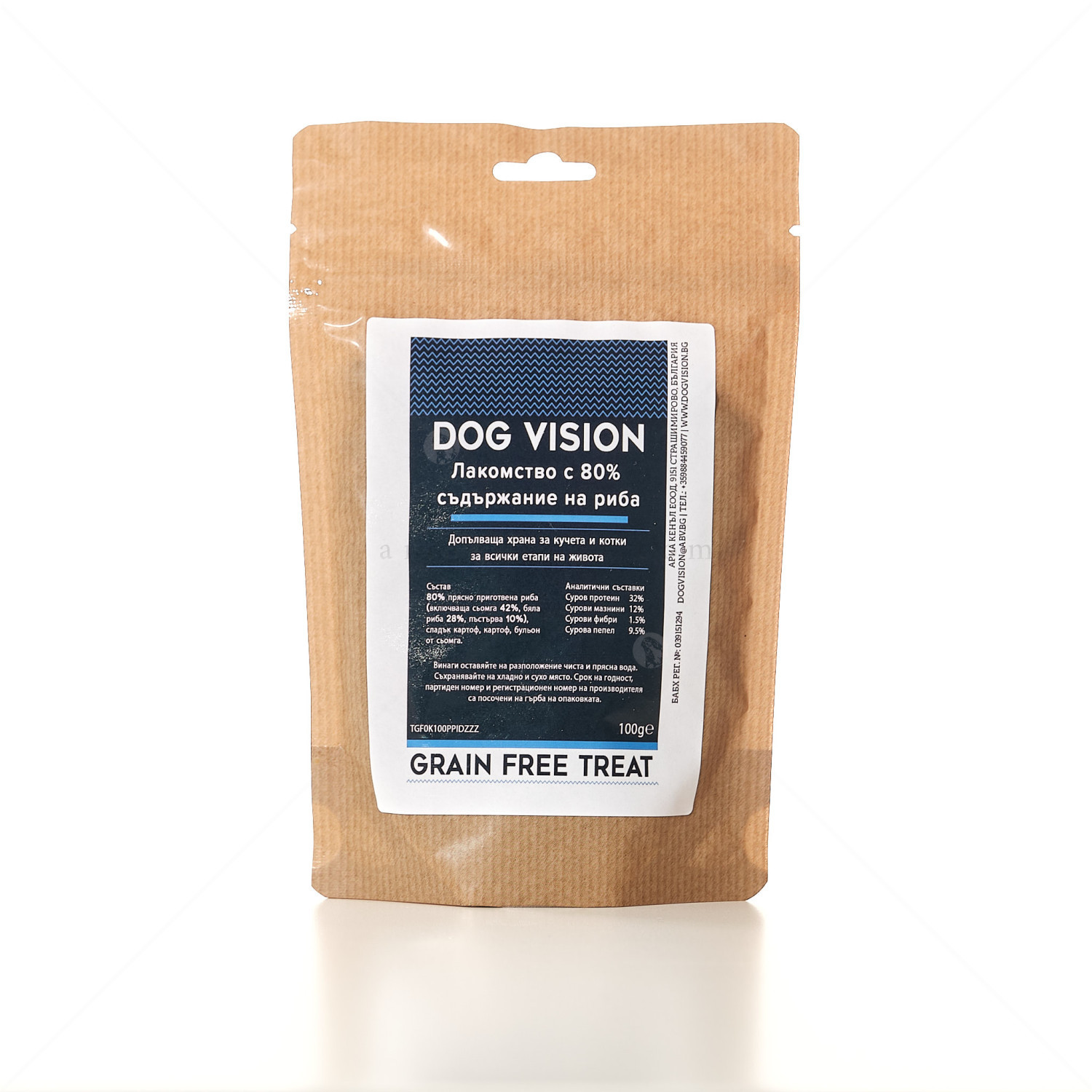Лакомството Dog Vision 80% Fish treats е изключително вкусно и хрупкаво лакомство под формата на рибки и е идеално за привличане и поддържане на вниманието на домашния любимец по време на обучение.