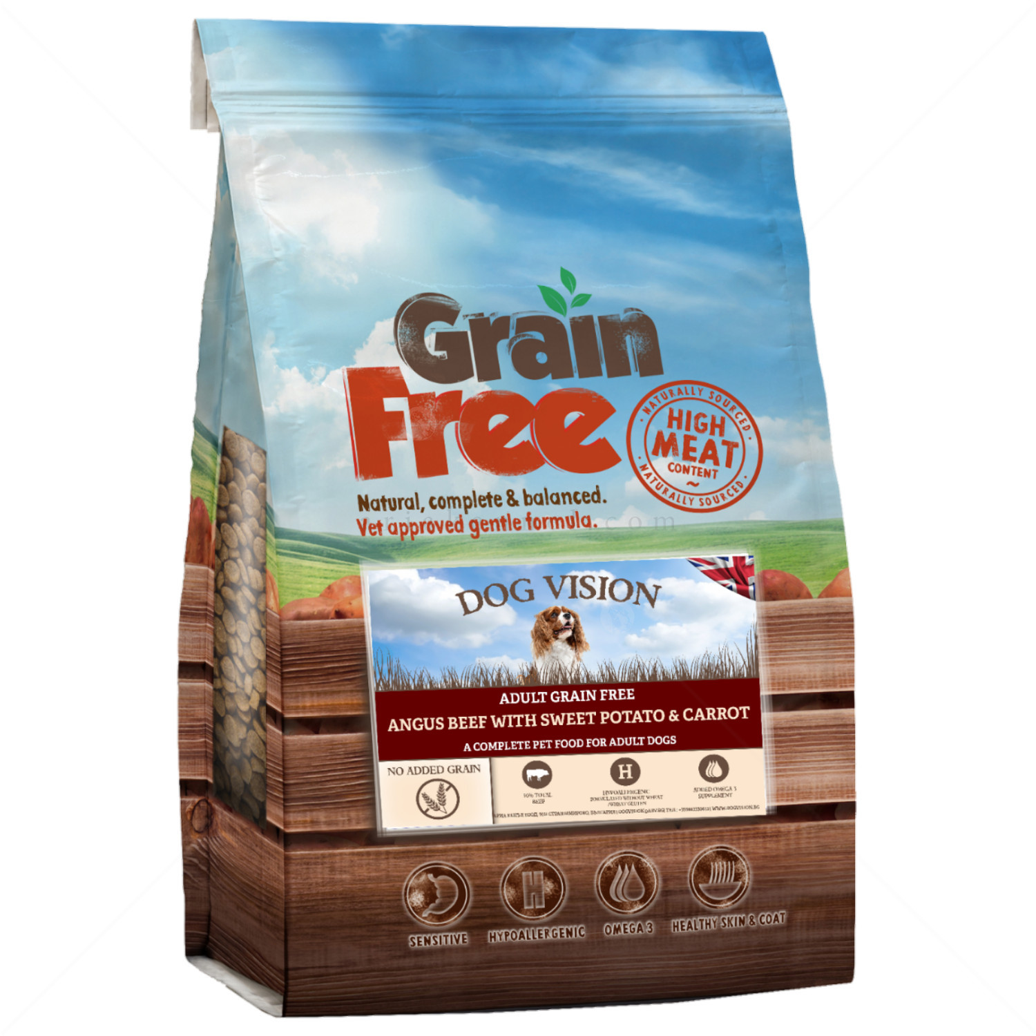 - без зърно, хипоалергенна – идеална диета, подходяща за кучета с непоносимост или чувствителност към зърнени храни;