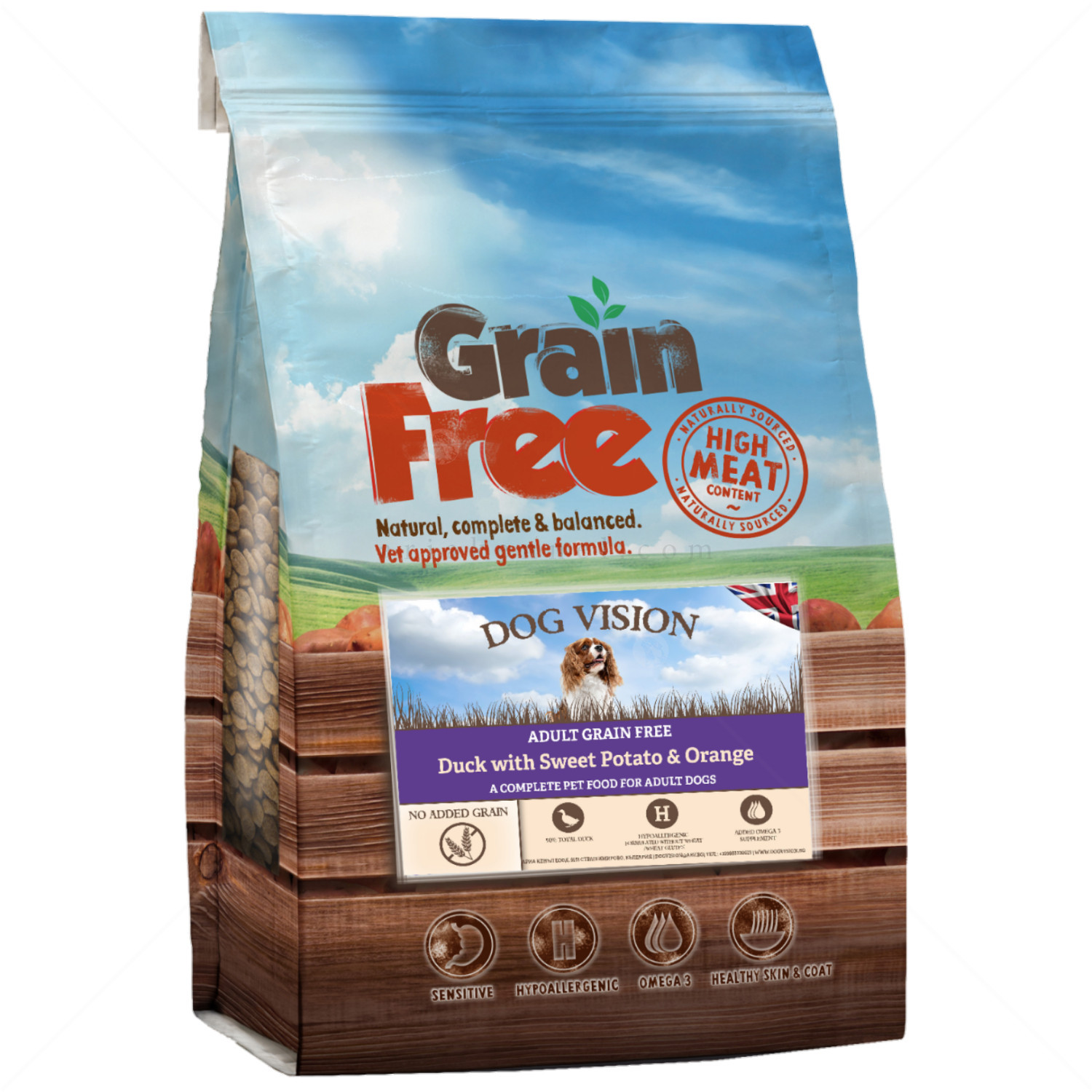 - без зърно, хипоалергенна – идеална диета, подходяща за кучета с непоносимост или чувствителност към зърнени храни;