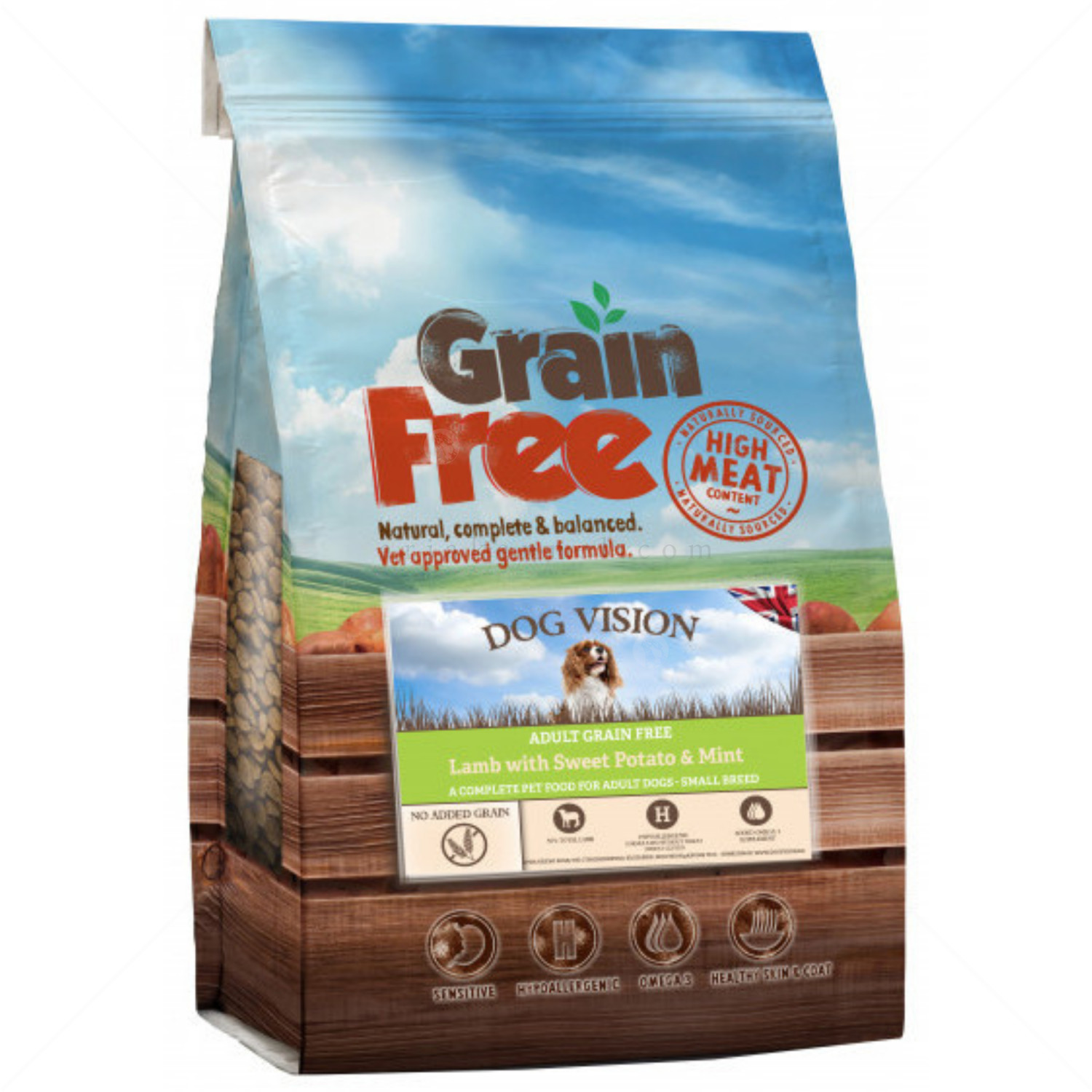 - без зърно, хипоалергенна – идеална диета, подходяща за кучета с непоносимост или чувствителност към зърнени храни;
