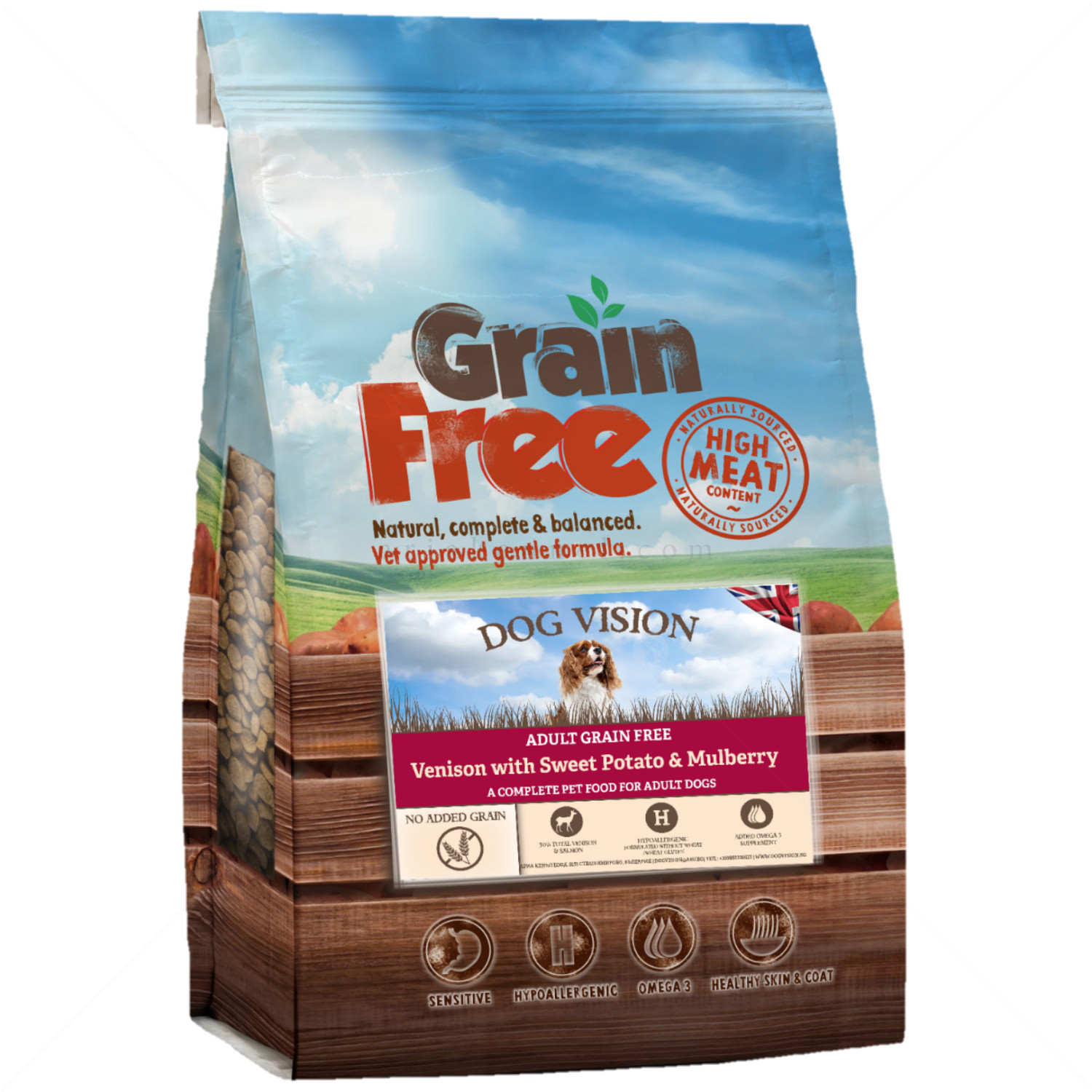 - без зърно, хипоалергенна – идеална диета, подходяща за кучета с непоносимост или чувствителност към зърнени храни;