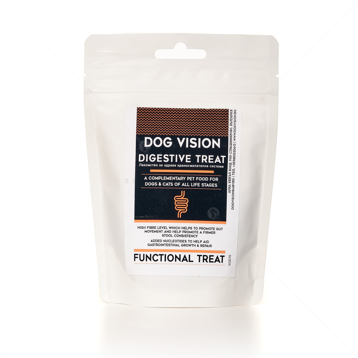 Доброто храносмилане е от изключително важно значение за здравето на домашния ви любимец. Той може да получи всички хранителни вещества, от които се нуждае, от неговата храна. Специалната рецепта на Dog Vision Functional treat Digestive е разработена, за да стимулира правилното движение на червата и растежа на полезните бактерии. От тях всъщност зависи здравословното състояние на стомашно-чревния тракт.