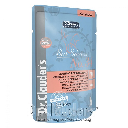 Пилето предлага на вашата котка много протеин, както и желязо. Сьомгата е богата на основни омега 3 мастни киселини. Месото е също така богато на витамини В12 и D. Добавената лайка има успокояващия ефект върху стомаха. Състав: 40% пилешко (пилешки сърца, пилешко месо, пилешки дроб, пилешки стомах), 30% сьомга, 1% минерали, 0,1% катнип, 0,1% лайка, 0,1% магданоз, 0.1% морски водорасли (спирулина). Аналитични съставки: суров протеин 10,5%, сурови мазнини 5.6%, сурова пепел 2.4%, сурови влакнини 0.5%, влага 74%. Добавки/kg: Хранителни добавки: цинк (като цинков сулфат, монохидрат) 25mg, манган (като манган-II-сулфат, монохидрат) 1.4 mg, мед (като меден сулфат, пентахидрат) 1,5mg, йод (като калциев йод, безводен) 0.75mg, таурин 1,500mg, DL-метионин 20mg, L-карнитин 200mg. Винаги осигурявайте прясна вода! Да се дава със стайна температура. Да се съхранява на хладно и сухо място.