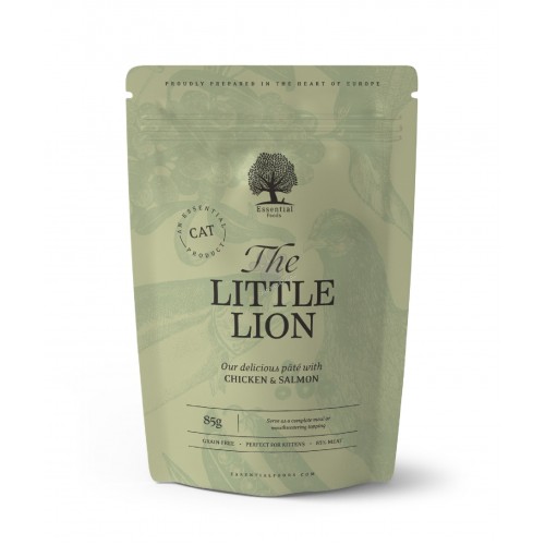 ESSENTIAL the LITTLE LION е изключително вкусен пастет с пилешки филенца в сос със сьомга. Пълноценна храна или апетитен топинг за котенца. Състав: пилешко филе (65%), черен дроб (15%), сьомга (5%), грахово брашно (3%), лигноцелулоза, калциев карбонат, облепиха (0,2%), латинка. Аналитичен състав: Суров протеин 9%, сурова мазнина 4,5%, сурова пепел 2%, сурови влакнини 0,5%, влага 82%. Хранителни добавки на кг: витамин A (3a672a) 400IU, витамин D3 (3a671) 120IU, цинк (3b606) 5 мг, желязо (3b106) 4 мг, манган (3b504) 1,2 мг, йод (3b201) 0,3 мг, таурин (3a370) 450 мг . Инструкции за даване: Сервирайте храната на стайна температура и винаги осигурявайте прясна питейна вода. Съхранявайте на хладно и сухо място. След отваряне съхранявайте в хладилник и използвайте в рамките на 3 дни.