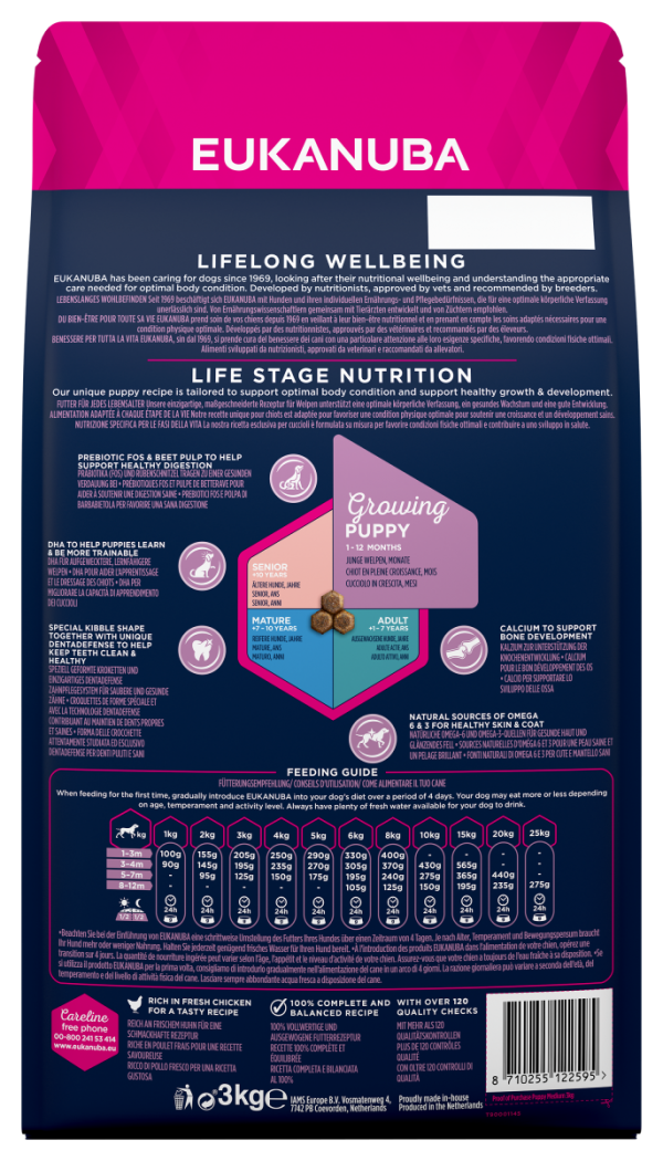 Кученцата от средните породи имат свои собствени хранителни изисквания. Тази система на Eukanuba осигурява нужните протеини, мазнини и въглехидрати, които да посрещнат тези нужди. Тя осигурява всички важни витамини и минерали необходими за оптимален растеж. Съдържа висококачествени съставки и високи нива на животински протеин, с пилешко като главен източник.