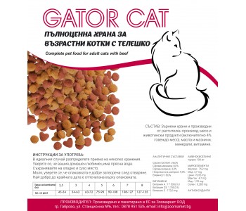 Gator Cat Beef e пълноценна и балансирана храна за възрастни котки с говеждо. Подходяща е за всички породи котки, живеещи както на открито, така и вкъщи. Може да се дава суха или полята с бульон.