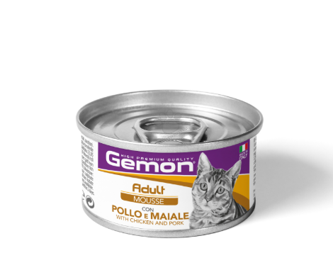 GEMON Adult Mousse with Chicken & Pork – консерва с пиле и свинско – пълноценна храна за котки в зряла възраст. СЪСТАВ: месо и животински производствени продукти 50% (прясно пилешко 15% и свински черен дроб 4%), масла и мазнини, минерали, различни захари. АНАЛИТИЧНИ СЪСТАВКИ: суров протеин 10,0%, сурови лакнини 0,3%, сурови мазнини 5.5%, суров пепел 2,7%, влага 79,0%. Добавки: хранителни добавки/кг: витамин D3 245 IU, витамин Е (ал-рак алфа-токоферил ацетат 3а700i) 15мг, селен (натриев селенит 0.05мг) 0.02мг, манган (манганов сулфат монохидрат 11.5мг) 3.75мг, цинк (цинков оксид 21.8мг) 17.5мг, мед (меден (II) сулфат пентахидрат 5.88мг) 1.5мг, желязо (железен (II) сулфат монохидрат 38мг) 12.5мг, йод (калциев йодат безводен 0,3 мг) 0,2 мг, таурин 500 мг. Инструкции за употреба: за котка в зряла възраст с тегло 4 кг се препоръчва дневна доза от 183 гр/ дневно, която може да се раздели на 2 храни. Осигурете постоянен достъп до прясна и чиста вода. Когато тази храна замества друга, се препоръчва постепенното въвеждане за период от поне 1 седмица. Храна за котки, не е подходяща за човешка консумация. Съхранявайте на сухо и хладно. След това се съхранява в хладилник до 2 дни.
