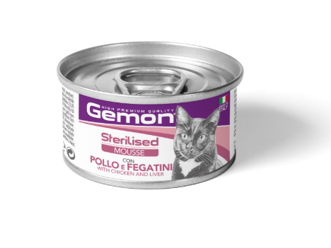 GEMON Sterilized Cat Mousse with Chicken & Liver – консерва с пиле и черен дроб – пълноценна храна за кастрени котки в зряла възраст. СЪСТАВ: месо и животински производствени продукти 50% (прясно пилешко 15% и пилешки черен дроб 4%), масла и мазнини, производствени продукти от растителен произход (влакнини от грах 1%), минерали, различни захари. АНАЛИТИЧНИ СЪСТАВКИ: суров протеин 10,5%, сурови лакнини 1%, сурови мазнини 5.5%, суров пепел 2,7%, влага 79,0%. Добавки: хранителни добавки/кг: витамин D3 245 IU, витамин Е (ал-рак алфа-токоферил ацетат 3а700i) 15мг, селен (натриев селенит 0.05мг) 0.02мг, манган (манганов сулфат монохидрат 11.5мг) 3.75мг, цинк (цинков оксид 21.8мг) 17.5мг, мед (меден (II) сулфат пентахидрат 5.88мг) 1.5мг, желязо (железен (II) сулфат монохидрат 38мг) 12.5мг, йод (калциев йодат безводен 0,3 мг) 0,2 мг, таурин 500 мг. Инструкции за употреба: за котка в зряла възраст с тегло 4 кг се препоръчва дневна доза от 190 гр/ дневно, която може да се раздели на 2 храни. Осигурете постоянен достъп до прясна и чиста вода. Когато тази храна замества друга, се препоръчва постепенното въвеждане за период от поне 1 седмица. Храна за котки, не е подходяща за човешка консумация. Съхранявайте на сухо и хладно. След това се съхранява в хладилник до 2 дни.