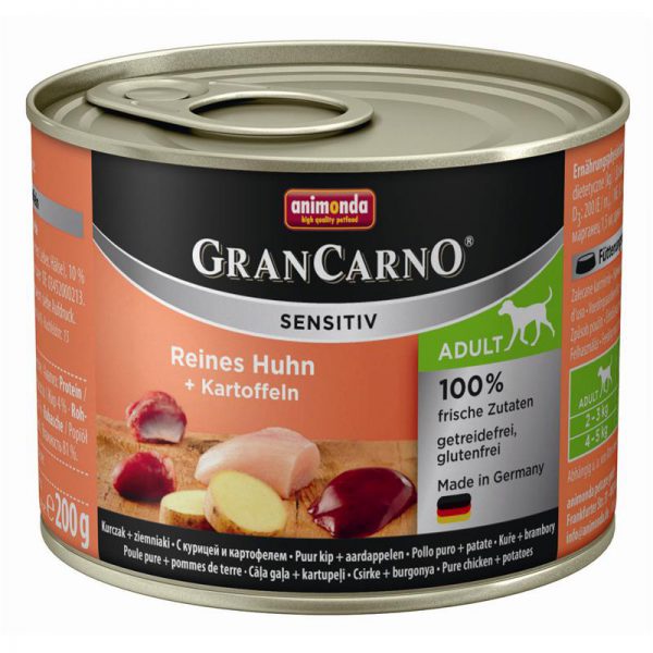 GranCarno®, Sensitiv е приготвена само с един източник на протеин (само пиле или говеждо или агнешко или пуйка) или в комбинация с лесно смилаеми картофи (без глутен).