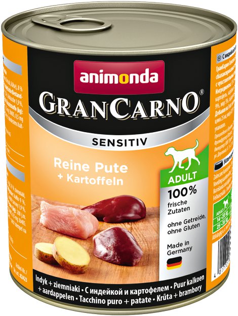GranCarno®, Sensitiv е приготвена само с един източник на протеин (само пиле или говеждо или агнешко или пуйка) или в комбинация с лесно смилаеми картофи (без глутен).