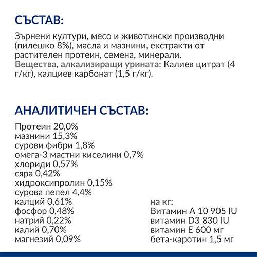 СЪСТАВ: Зърнени култури, месо и животински производни (пилешко 8%), масла и мазнини, екстракти от растителен протеин, семена, минерали. Вещества, алкализиращи урината: Калиев цитрат (4 г/кг), калциев карбонат (1,5 г/кг).