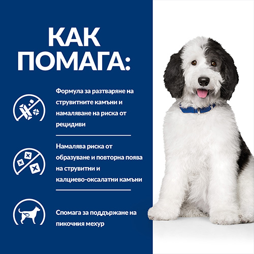 Експертите по хранене и ветеринарните лекари на Hill’s разработиха диетичната храна за кучета Prescription Diet c/d Multicare специално за поддържане на пикочната система и намаляване на риска от струвитни и калциево-оксалатни камъни. Тази суха храна се приготвя с пилешко и има неустоим вкус, който кучето ви ще обикне.