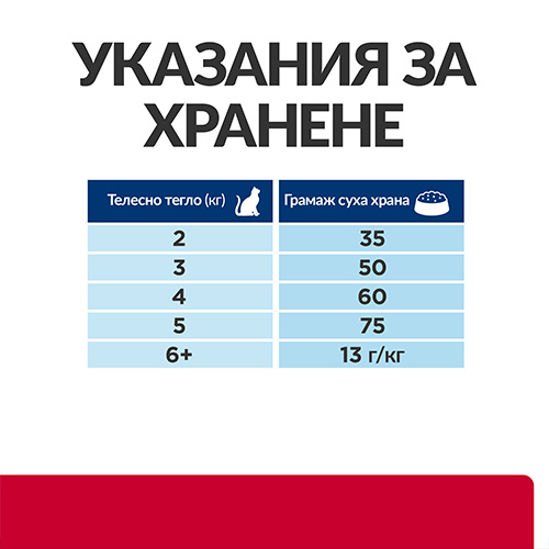 Поискайте от ветеринарния лекар да Ви даде конкретни указания за храненето на вашия домашен любимец. Това са само общи насоки. Грамовете са най-точната форма на измерване. Ако използвате мерителна чашка на Hill’s, вижте cup.hillspet.com.