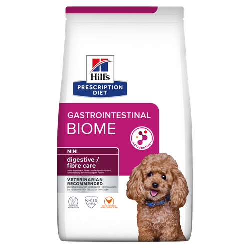 Hill’s Prescription Diet Gastrointestinal Biome Mini е диетична суха храна, специално разработена за кучета от дребни породи и е подходяща за даване при храносмилателни проблеми. Иновативният състав ActivBiome+ може да насърчи оптималната чревна флора и здравословна, редовна дефекация.