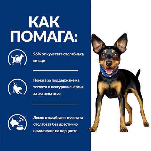 Експертите по хранене и ветеринарните лекари на Hill’s разработиха клиничната храна за кучета Prescription Diet Metabolic специално за отслабване и поддържане на теглото. Действа съобразно индивидуалния разход на енергия на кучето за лесно и ефективно отслабване. Тази храна стимулира естествената способност на кучето да изгаря излишните мазнини и осигурява енергия за активна игра. Нейният уникален микс от фибри помага на кучетата да се чувстват сити и доволни. Всъщност, 96% от кучетата, хранени у дома с Metabolic, отслабнаха в рамките на 2 месеца.* Тази суха храна се приготвя с пилешко и има неустоим вкус, който кучето ви ще обикне.
