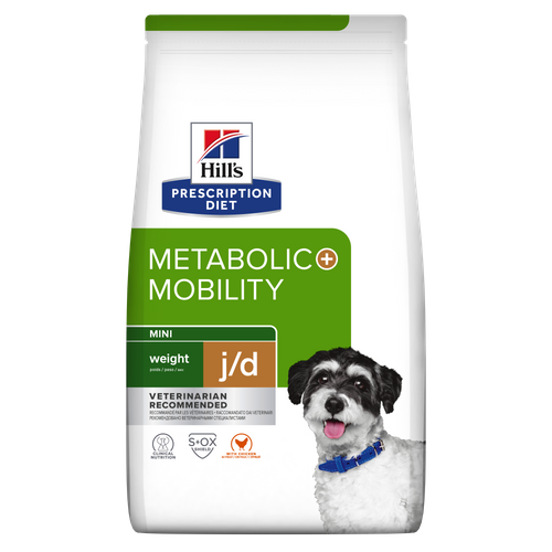 Сухата храна за кучета Hill’s Prescription Diet Metabolic + Mobility Mini осигурява всички хранителни вещества, необходими на кучето за отслабване и поддържане на теглото, като същевременно поддържа ставите в добро състояние. Вашият ветеринарен лекар ще ви разкаже повече за това как нашите храни от линията Prescription Diet могат да помогнат на кучето ви да продължи да води щастлив и активен живот.