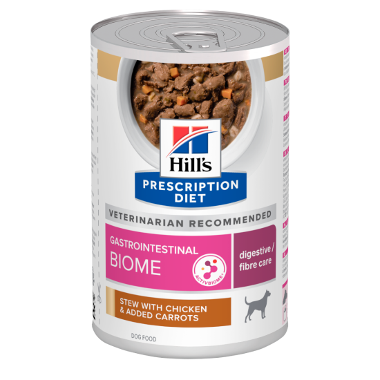Храната за кучета Hill’s PRESCRIPTION DIET Gastrointestinal Biome с технология ActivBiome + клинично доказано овладява диарията само за 24 часа и намалява риска от рецидив. Тя е специално разработена от хранителните експерти и ветеринарните лекари на Hill’s за кучета с чувствителен стомах за насърчаване на здрави изпражнения и поддържане на цялостното храносмилателно здраве. Кучето ви ще обикне това неустоимо задушено с вкусни хапки в сос, приготвено с полезни съставки като пиле и зеленчуци.