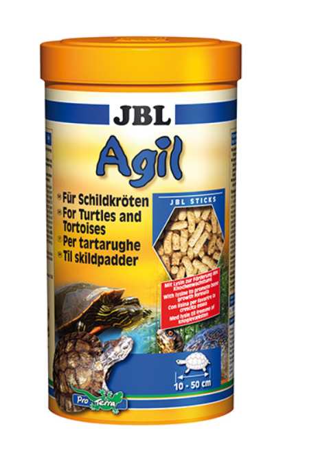 JBL Agil 1l – Храна за костенурки – гранули. Основна храна за водни костенурки. Хранителна добавка за сухоземни костенурки. Богата на протеини храна от риба и скариди във високоусвояем вид. Съдържа лизин за поддържане на здравословен и оптимален растеж на костите. Комплекс от мултивитамини и стабилизиран Витамин С, за подсилване на имунната система и срещу устойчивостта на заболяванията. Препоръчително хранене: Водни костенурки: В зависимост от рамата им, на подрастващите костенурки се дава количество, което може да се изяжда за около 10мин., 2-4 пъти на ден. На зрелите костенурки се дава по същия начин 4-5 пъти в седмицата. Сухоземни костенурки: Поради високото протеиново съдържание, Agil може да им се дава само като допълнителна храна, за разнообразие на диетата им. За слабите животни може да се дава и като основна храна за ограничен период от време. Накиснете предварително във вода за кратко време необходимото количество.