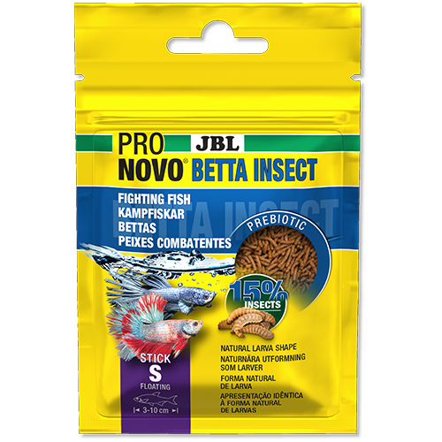 Пребиотична и плаваща храна за аквариумни рибки: специалните диетични влакнини в храната доставят храна за полезните чревни бактерии за здравословно храносмилане • Натурални суровини без изкуствени добавки за естествена диета и здрави рибки. • Много добро приемане сред всички видове бойни рибки благодарение на висококачествени суровини като сьомга, скариди, калмари и крил • С висококачествен естествен астаксантин от крил и спирулина, който осигурява перфектно оцветяване при бойни риби Животински видове: бета, гурами Размер на рибите: 3 – 10 см. Тип храна: пръчици. Цвят: кафяво Дозировка: Хранете 1 – 2 пъти дневно, толкова колкото рибките изяждат за няколко минути Аналитични съставки: суров протеин 42.0%, мазнини: 6.0%, сурови влакнини: 3.0%, сурова пепел: 8.0%. Състав: Протеин от насекоми (Hermetia), пшенично брашно, брашно от скариди, пшеничен зародиш, оризово брашно, брашно от сьомга, брашно от октопод, брашно от соеви зърна, екстракт от дрожди. Добавки: Антиоксиданти: E 306. Оцветители: не. Витамини за кг: витамин A: 25000 IU, витамин D₃: 3000 IU, витамин E: 300 мг, витамин C: 200 мг.