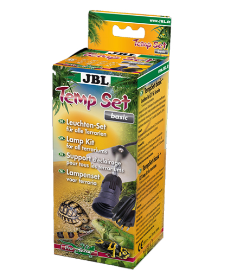 JBL TempSet Basic – фасoнка-комплект за терариум. Готови за монтаж за безопасна експлоатация на енергоспестяващи лампи, лампи с нажежаема жичка, халогенни спот лампи, неодимови спот лампи, UV спот лампи, (отвесно монтиране само) и керамични лампи. Изработено е от високотехнологичен материал и е устойчиво на топлина до (270 ° C) и по този начин осигурява по – голяма безопасност в терариума. Изключително лесен за инсталиране. В комплекта са включени: 1.5 m кабел, винтове и превключвател за мощност до 250W.
