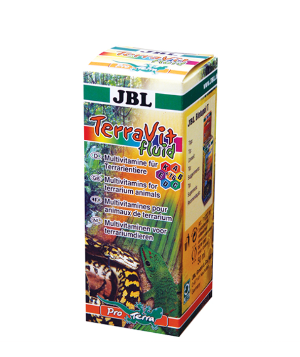 JBL TerraVit Fluid 50ml – Мултивитамини за терариумни животни (земноводни, влечуги). Под формата на течност – може да се постави във водата за пиене, във водата за къпане или в храната – там където витамините на прах не полепват добре. Специален процес на емулгиране чрез използване на лецитин, увеличава времето, през което витамините остават активни във водата и запазват качеството си. За добро здраве при всички терариумни животни, спомага за предотвратяването на заболяванията, причинени от недостиг на вещества, благоприятства растежа, повишава апетита и подпомага естествения процес на сммяна на кожата. Забележка: Това като тази хранителна добавка е с по-високо съдържание на вит. D3 от основната храна, тя трябва да бъде само 20% от дневната дажба. Това се отнася за основното хранилище с минимум 88% сухо вещество.