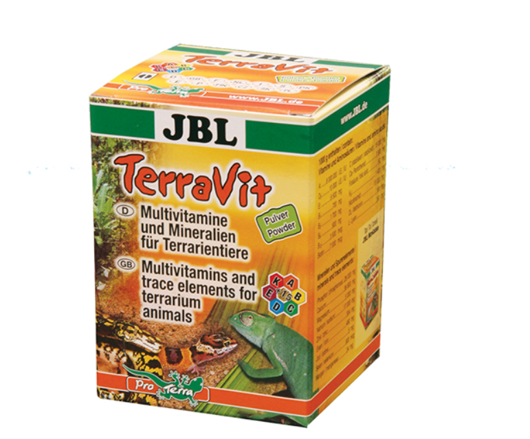 JBL TerraVit 100g – Мултивитамини и микроелементи на прах за терариумни животни (земноводни, влечуги). Съдържа важни аминокиселини и микроелементи. За поддържане на доброто здраве, предотвратяване на заболявания, причинени от недостиг на вещества. Благоприятствата на растежа, увеличават апетита и подпомагат естествения процес на промяна на кожата. JBL TerraVit Powder не е напълно разтворим и трябва да се дава с храната. Начин на употреба: може просто да бъде поръсен върху храната (полепва по-добре върху леко навлажнена храна. Живата храна – насекоми, се поставя в контейнер заедно с една мерителна лъжица JBL TerraVit Powder и контейнерът се разклаща, докато насекомите се покрият достатъчно с пудрата. Тъй като тази хранителна добавка е с високо съдържание на вит D3 от основната храна, тя трябва да бъде до 20% от дневната храна.