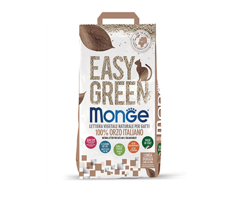 Easy Green 100% Ечемик е новата натурална тоалетна котешка на растителна основа от Monge. Произведен от 100% италиански ечемик, с изключителна мекота на докосване: текстурата на гранулите е мека и нежна към лапите на котката, поради което е идеално за котенца и застаряващи котки, които често се намират за неприятни гранули на минералните и силиконови тоалетни.. Гранулите са с единкъв размер, с висока способност за абсорбиране, което намалява значително праха. Активната съставка разлага молекулите на миризмата, като така елиминира, а не прикрива миризма. Easy Green 100% Barley е супер слепваща: топките, образувани от урината, могат да се отстранят след секунди. Слепващите свойства на ечемика позволяват да се отстрани само отпадъка от котешката тоалетна, за да се удължи живота на тоалетната. Топките могат да бъдат изхвърлени с органичния отпадък или да се изхвърлят с умереност в тоалетната (максимум 2 бр. веднъж). Тоалетната е на 100% растителна основа, екологична и органична.