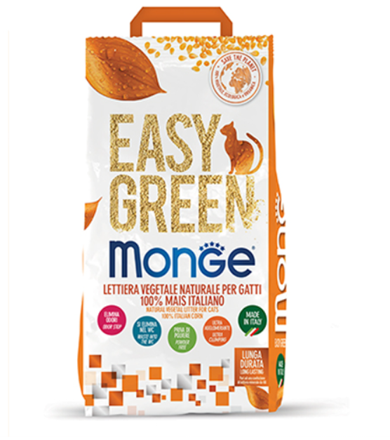 Easy Green 100% Царевица е новата натурална тоалетна котешка на растителна основа от Monge. Произведена от 100% италианска царевица, с изключителна мекота на докосване: текстурата на гранулите е мека и нежна към лапите на котката, поради което е идеално за котенца и застаряващи котки, които често се намират за неприятни гранули на минералните и силиконови тоалетни. Easy Green 100% Corn е супер слепваща: топките, образувани от урината, могат да се отстранят след секунди. Тоалетната е обезпрашена и подходяща за котенца. Активната съставка разлага молекулите на миризмата, като така елиминира, а не прикрива миризма. Тоалетната е 100% биоразградима и щадяща околната среда. Може да се изхвърли с органичния отпадък или топките да се изхвърлят с умереност в тоалетната (максимум 2 бр. наведнъж).