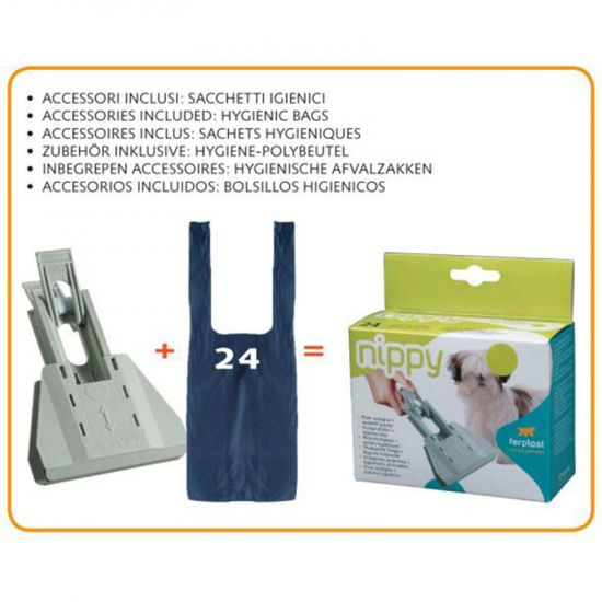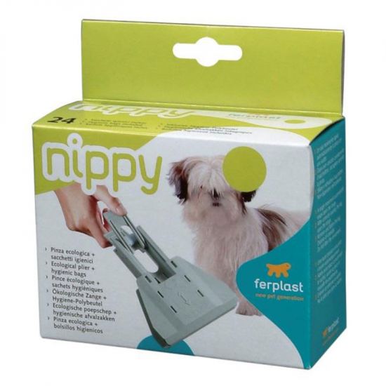 NIPPY е практична пластмасова лопатка за събиране на изпражненията на Вашия домашен любимец. Лопатката е лесна и удобна за използване само в три лесни стъпки: отворете лопатката, докато чуете щракване, закачете хигиенната торбичка на посоченото място и съберете изпражненията чрез отваряне. След това извадете торбичката и затворете лопатката отново. Когато е затворена, Nippy Scoop заема много малко място и може да се постави в чантата или джоба, готова за следващата употреба. При покупка на NIPPY ще получите и пакет от 24 хигиенни торбички, които също така могат да бъдат закупени и по отделно. Размери: 12,6 x 5,2 x h 9,7 cm