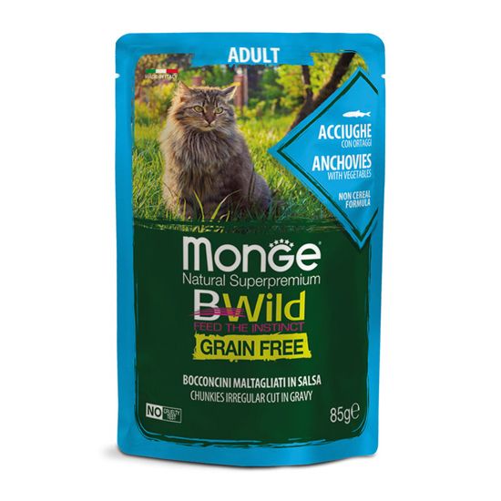 Monge Natural Superpremium BWild Grain Free Adult Cat с аншоа и зеленчуци (зелен фасул и моркови) е пълноценна и балансирана храна за котки в зряла възраст. Пауч с неправилно нарязани хапки в сос – аншоа със зеленчуци (зелен фасул и моркови). Без съдържание на зърнени храни.
