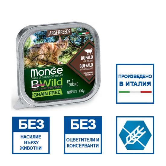 Monge Natural Superpremium BWild Grain Free e All Life Stage Large Breeds Cat биволско със зеленчуци (фасул и моркови) е пълноценна и балансирана храна за котенца (>2мес) и възрастни котки от едрите породи. Пастет – биволско със зеленчуци (зелен фасул и моркови). Без съдържание на зърнени култури.