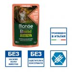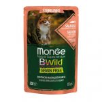 Monge Natural Superpremium BWild Grain Free Sterilised Cat със сьомга, скариди и зеленчуци (зелен фасул и моркови) е пълноценна и балансирана храна за кастрирани котки в зряла възраст. Пауч с неправилно нарязани хапки в сос – сьомга със зеленчуци (зелен фасул и моркови). Без съдържание на зърнени култури.