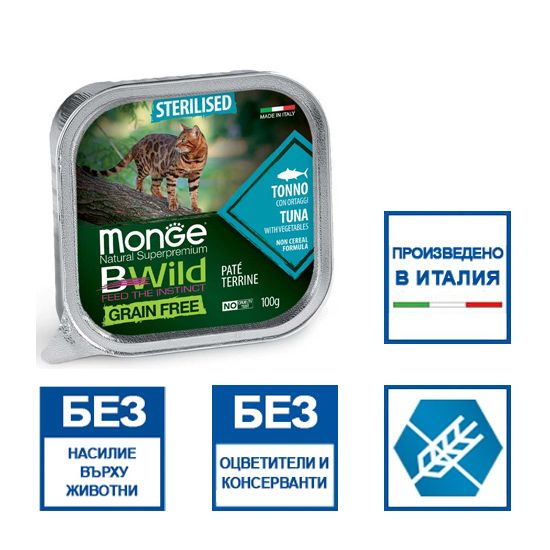 Monge Natural Superpremium BWild Grain Free Sterilised Cat риба тон и зеленчуци (зелен фасул и моркови) е пълноценна и балансирана храна за кастрирани котки в зряла възраст. Пастет – риба тон със зеленчуци (зелен фасул и моркови). Без съдържание на зърнени култури.