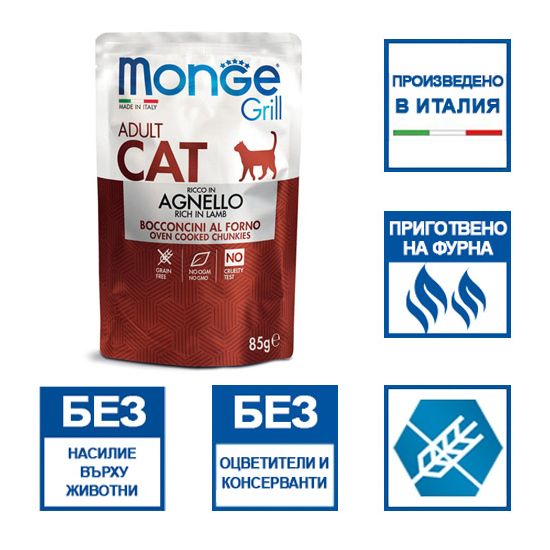 Monge Grill са хапки, приготвени на фурна, в желе, които максимално наподобяват естествената диета на вашите котки. Рецептите съдържат висококачествени меса, произведени специално, заради хранителни си качества. Monge Grill са без зърнени храни, с картофи като уникален източник на въглехидрати. Предназначени да отговорят на оптималните хранителни нужди на конкретна възраст или физиологично състояние. Перфектните съставки за капризни котки.