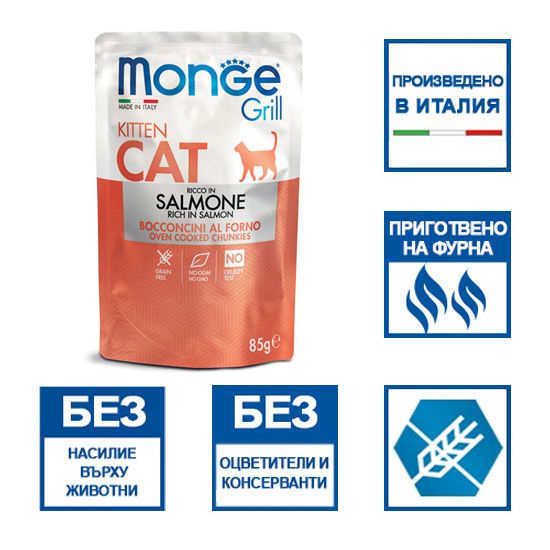 Monge Grill са хапки, приготвени на фурна, в желе, които максимално наподобяват естествената диета на вашите котки. Рецептите съдържат висококачествени меса, произведени специално, заради хранителни си качества. Monge Grill са без зърнени храни, с картофи като уникален източник на въглехидрати. Предназначени да отговорят на оптималните хранителни нужди на конкретна възраст или физиологично състояние. Перфектните съставки за капризни котки.