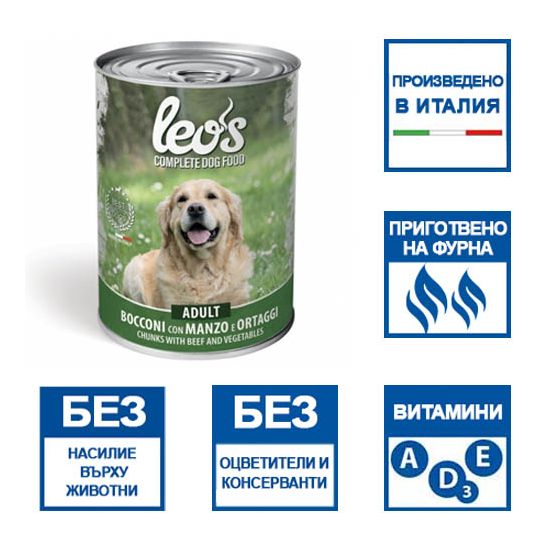 Състав: Месо и животински производни (телешко 14%), зеленчуци (4%), зърнени храни, производни от растителен произход, минерали.