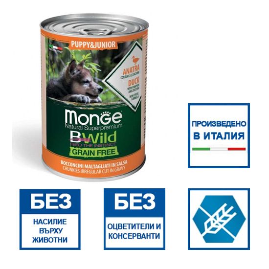 Monge Natural Super Premium Bwild Grain Free Formula Dog Puppy & Junior Duck с тиква и тиквички е пълноценна и балансирана храна за подрастващи кученца, от 1 месец до достигане на зряла възраст. Специално разработена за кученца от всички породи, чрез селекция от алтернативни не-зърнени въглехидратни източници като тиквички и тиква. Рецептата е подобрена с ксило-олигозахариди (XOS), следващо поколение пребиотици за поддържане на чревното здраве. Формулата подпомага правилния растеж на ставите, поради добавянето на глюкозамин и хондроитин сулфат и балансирано съотношение калций / фосфор. Препоръчва се за кученца от всички породи.