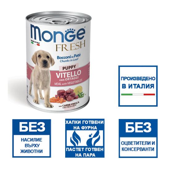 Monge Fresh Dog Puppy Chunks in Loaf with Veal and Vegetables – консерва с телешко и зеленчуци – хапки в пастет за подрастващи кученца