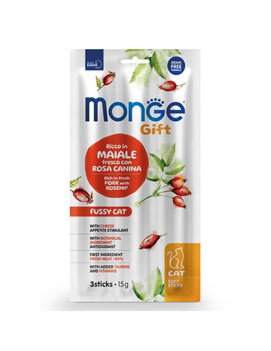 Гледай видеотоКотка Лакомства Меки и дъвчащи лакомства Monge Cat Soft Sticks Fussy, 3×5г