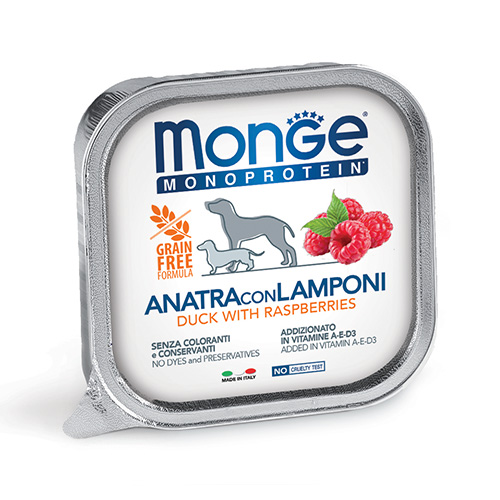 Монопротеинова храна за кучета, под формата на пастет. Формулирана с единствен източник на животински протеин (патешко) и източник на въглехидрати (тапиока). С малини като източник на витамини и минерали.