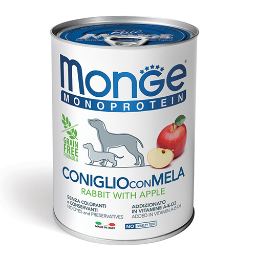 Монопротеинова храна за кучета, под формата на пастет. Формулирана с единствен източник на животински протеин (заешко) и източник на въглехидрати (тапиока). С ябълка като концентриран източник на витамини и минерали, както и на влакнини храносмилателен баланс.