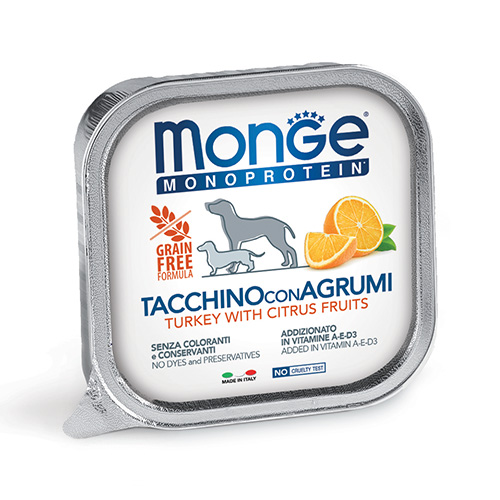 Монопротеинова храна за кучета, под формата на пастет. С единствен източник на животински протеин (пуешко) и цутрусови плодове.
